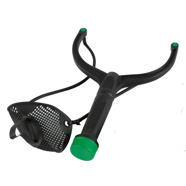 Praćka sa velikim i čvrstim ramom, kvalitetnom šupljom gumom i prostranom korpom za izbacivanje kugli prihrane.